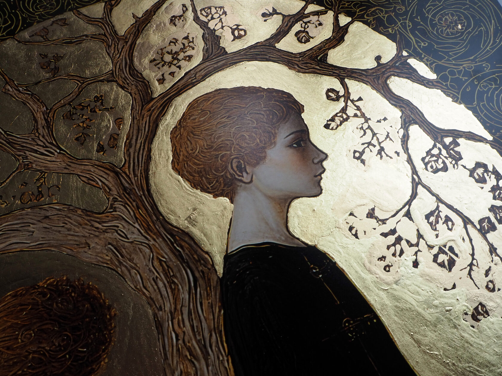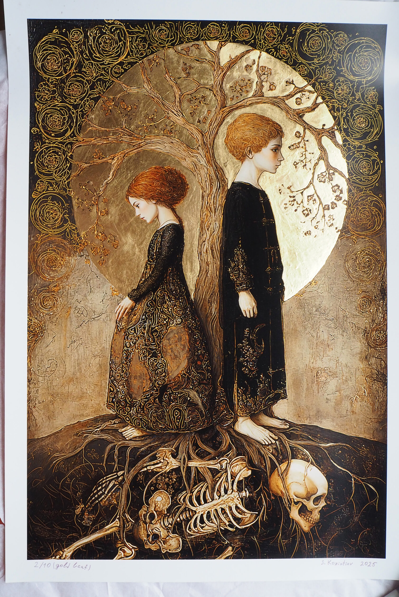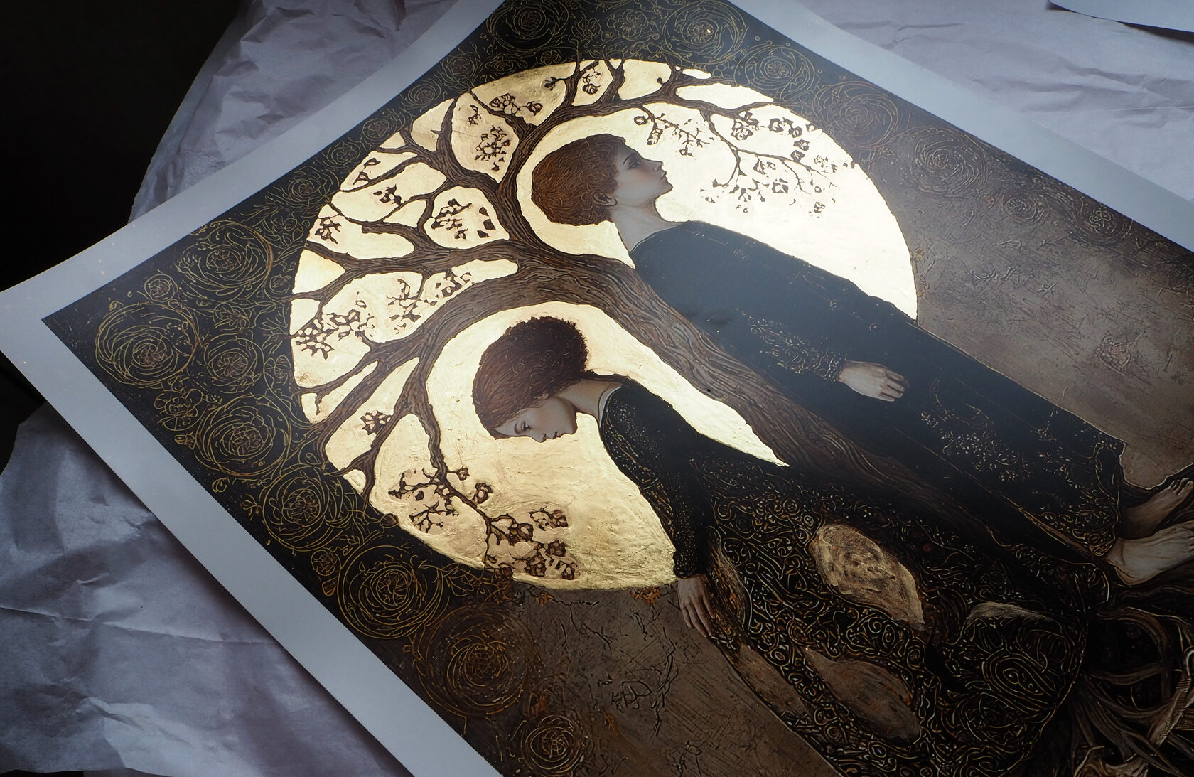 40x60 см. С полями 45x65см Работа о преемственности и памяти, о том, как жизнь вырастает из корней прошлого. Свет и золото символизируют продолжение, переход от земли к небу, от тьмы к осознанию Доставляется без рамы