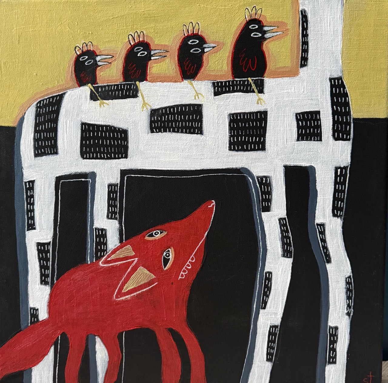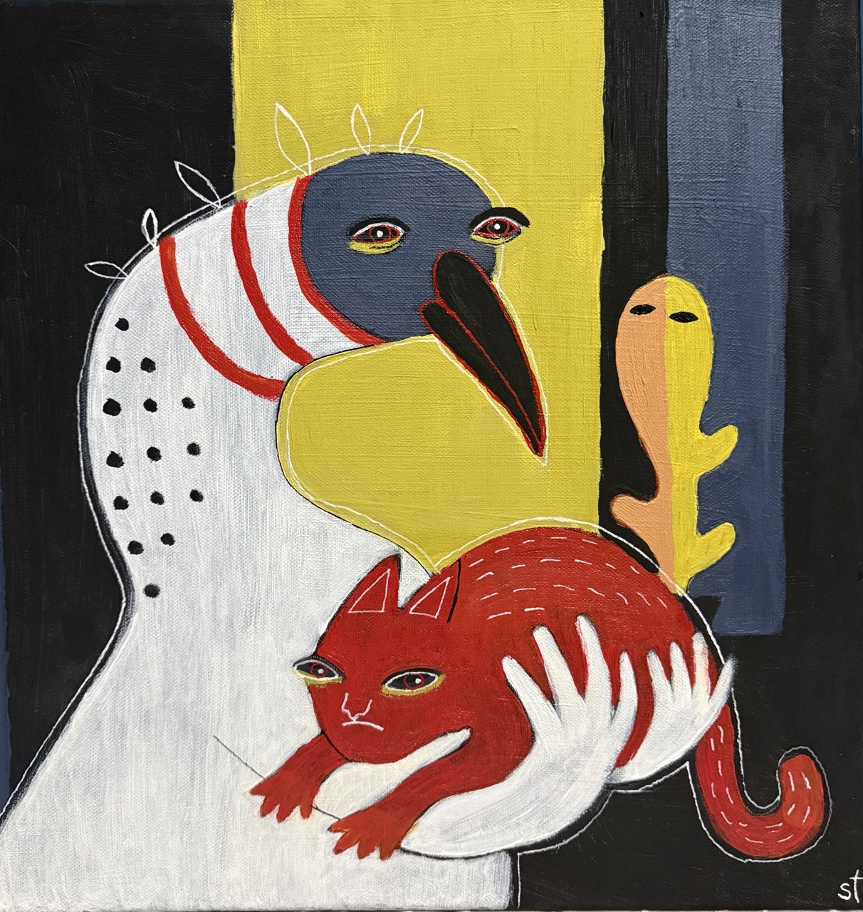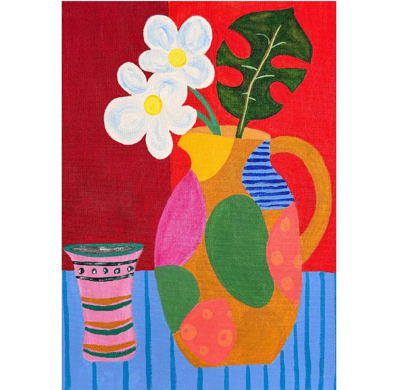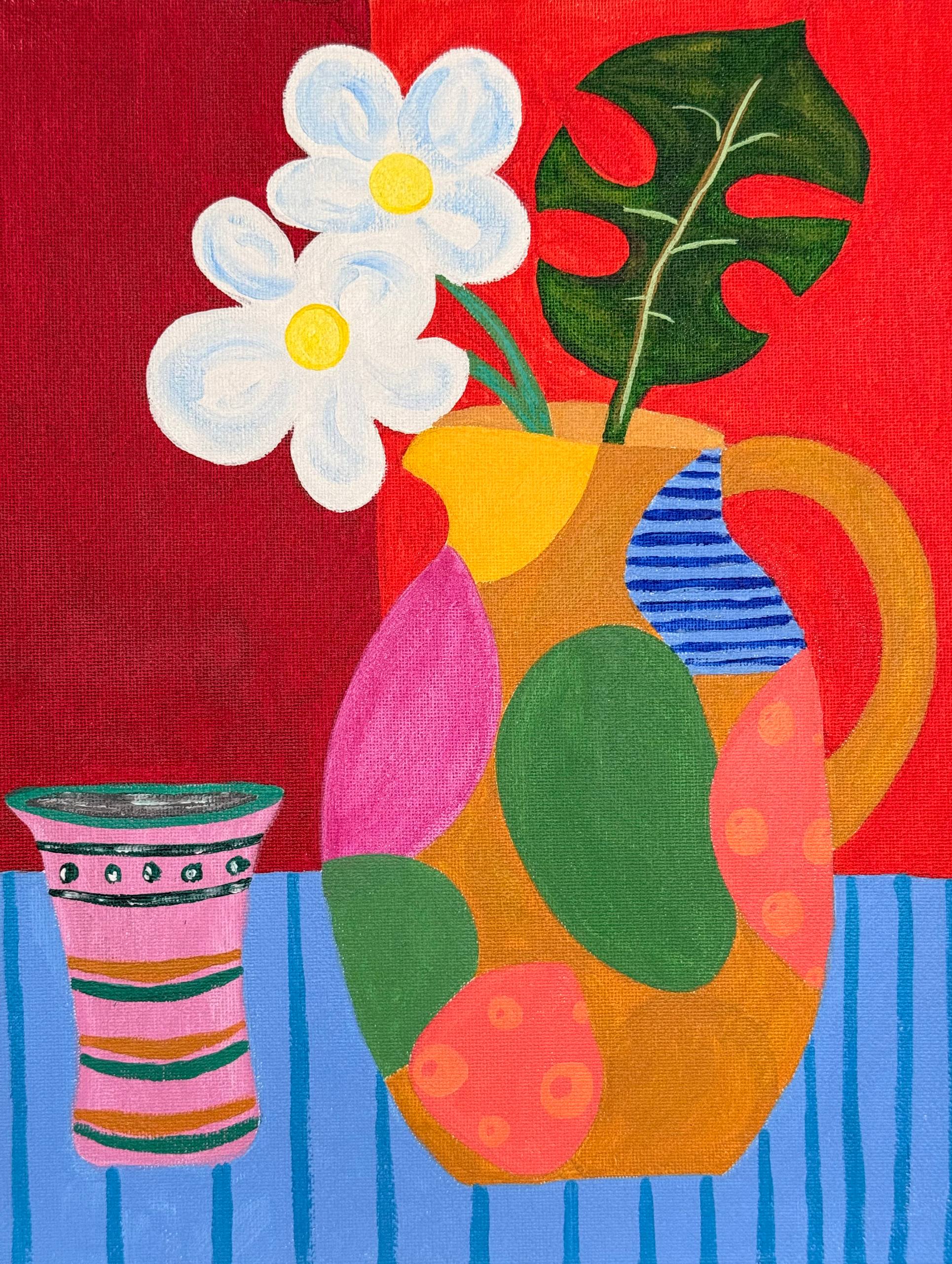 Яркая, декоративная натюрмортная зарисовка в стиле наивной живописи: крупный глиняный кувшин, расписанный большими плоскостными пятнами ,стоит на полосатом столе и заполняет центральное пространство картины. Из него торчат два простых белых цветка с жёлтыми сердцевинами и монстеровская зелёная листва — контраст формы и цвета придаёт полотну игривую динамику. Фон разделён на две насыщенные плоскости, что усиливает декоративность и словно подсвечивает кувшин. Слева — маленькая полосатая чашка с узором уравновешивает композицию и добавляет ощущение уюта. Простые контуры, насыщенные чистые цвета и отсутствие тональной моделировки создают ощущение лёгкости, радости и летнего настроения. Картина напоминает о солнечном завтраке в тёплом доме, где каждая вещь — как маленький праздник.