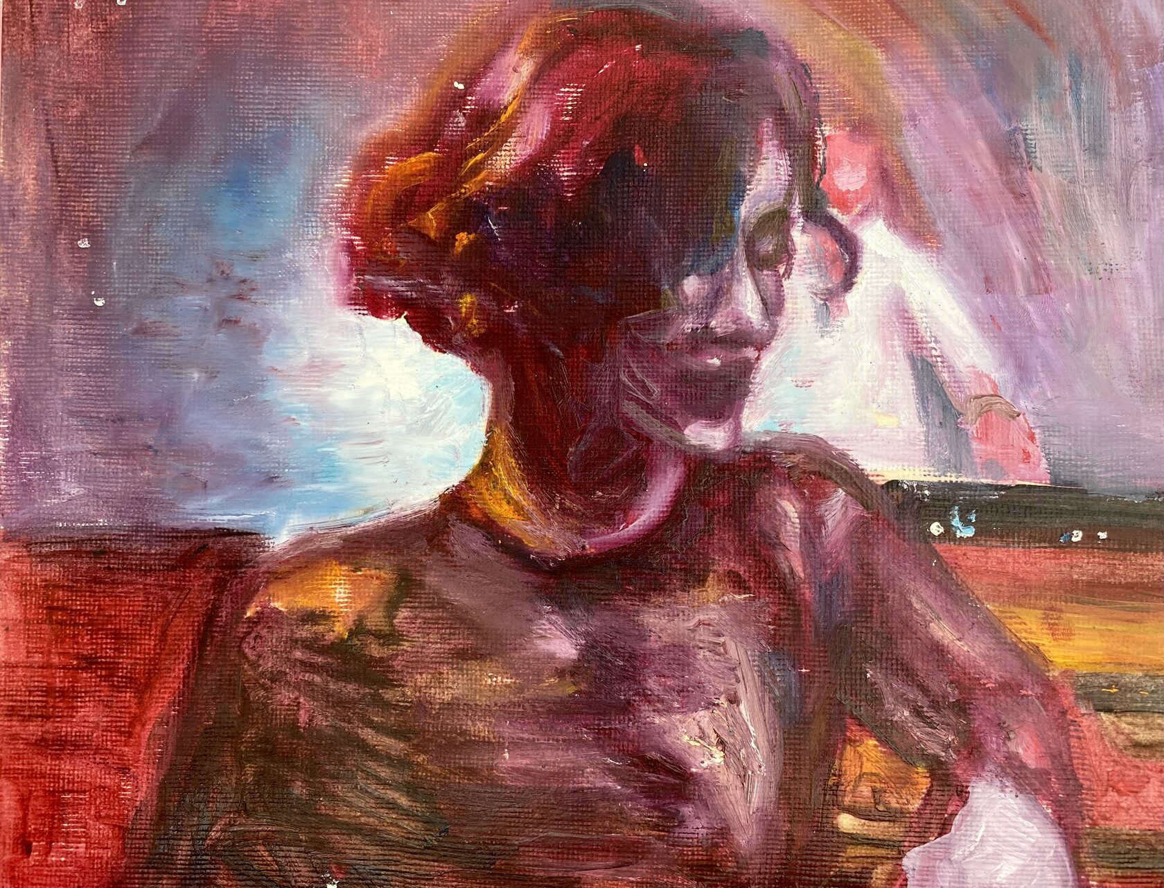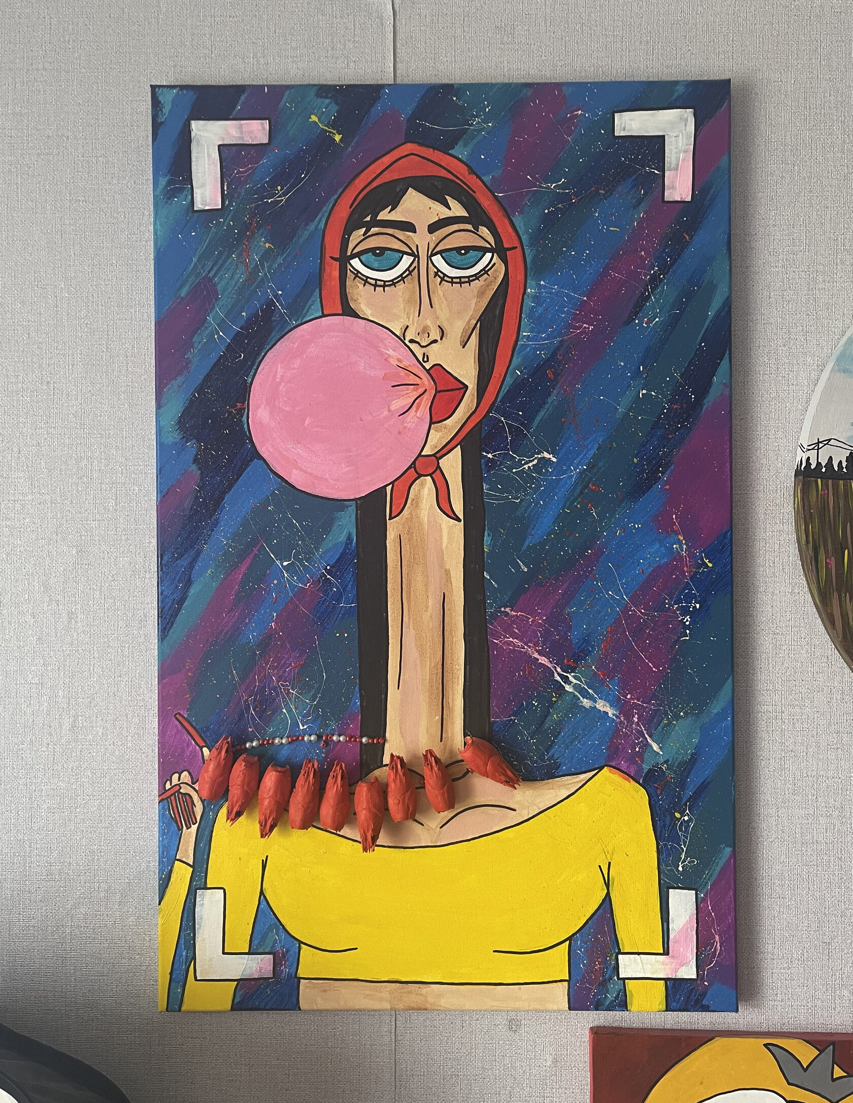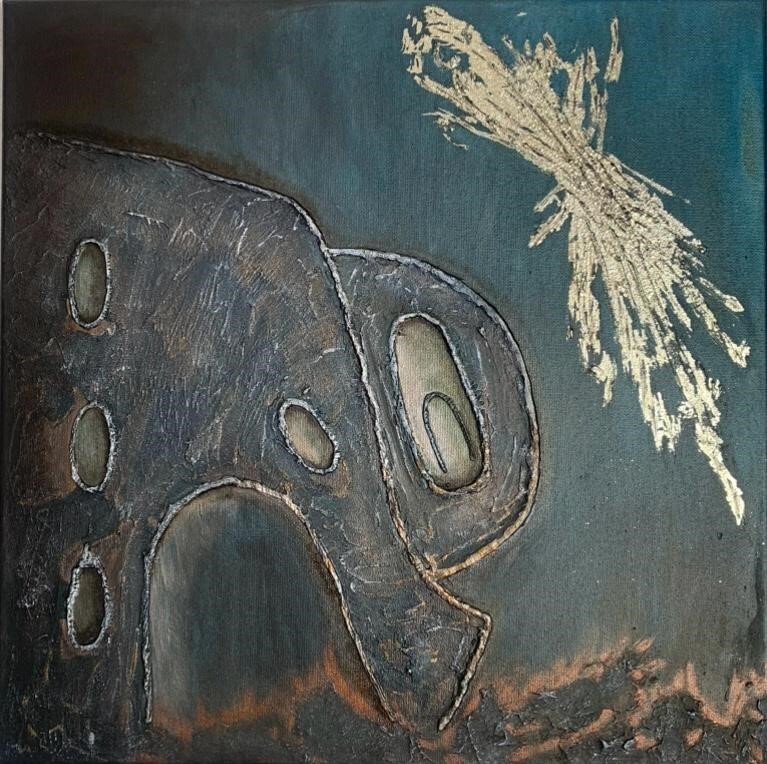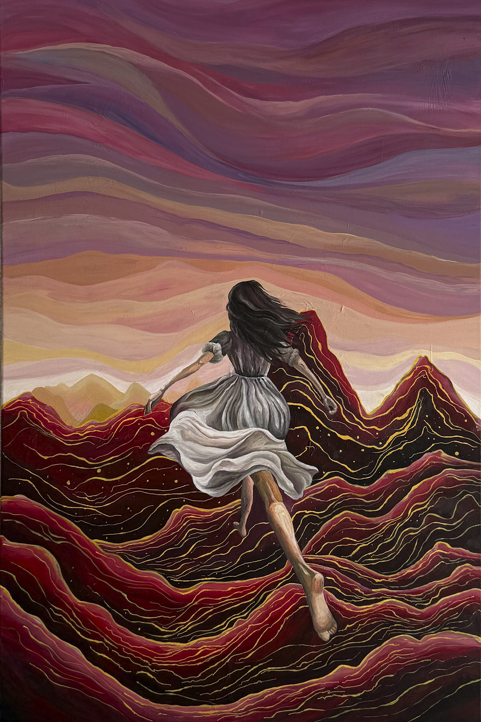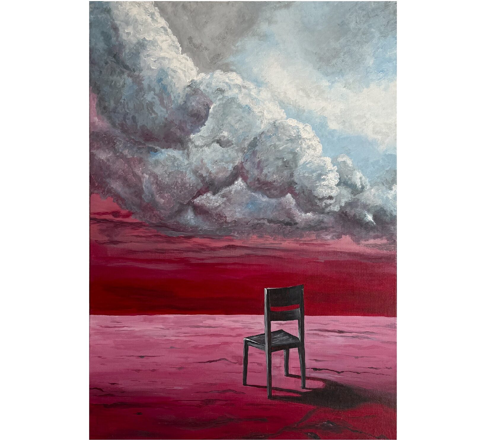 Погребена под их взглядами — это работа о сокрытом, о внутреннем «я», которое не может пробиться сквозь слой чужих суждений. Здесь фигура словно растворяется под тяжестью взглядов, оценок и общественных норм. Цвета налегают друг на друга, как слои восприятия, создавая напряжение и ощущение подавления. Контур тела проступает из-под размытых форм, но остаётся неуловимым — как попытка быть увиденным, не становясь объектом суждений. Это не просто образ, а вопрос: а кто я, если снять с себя чужой взгляд?