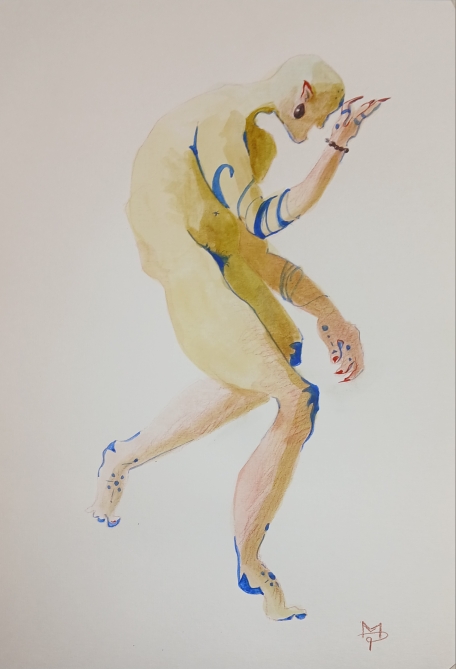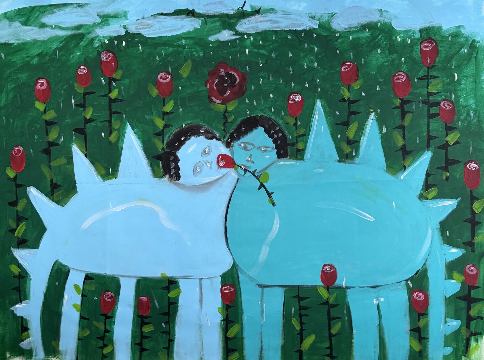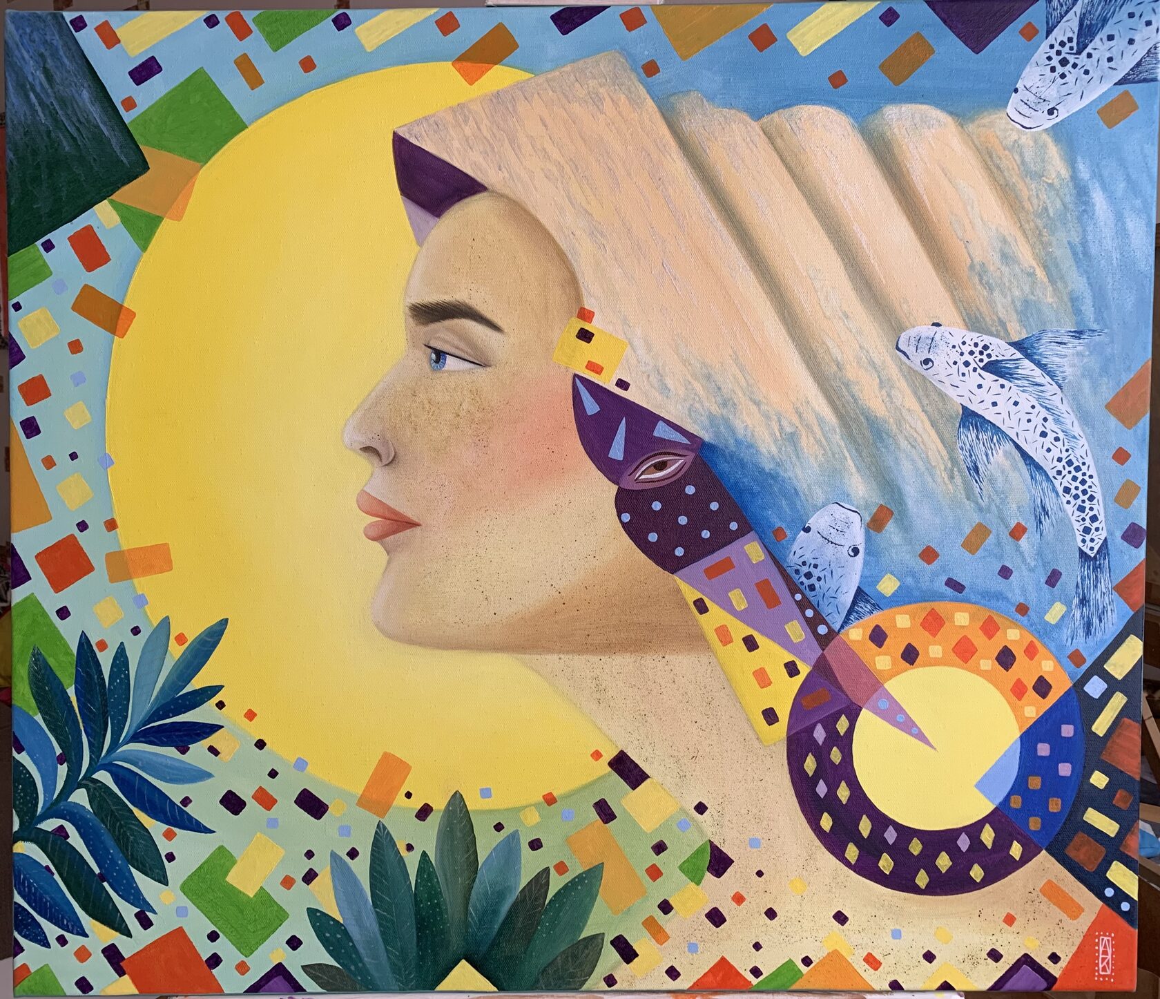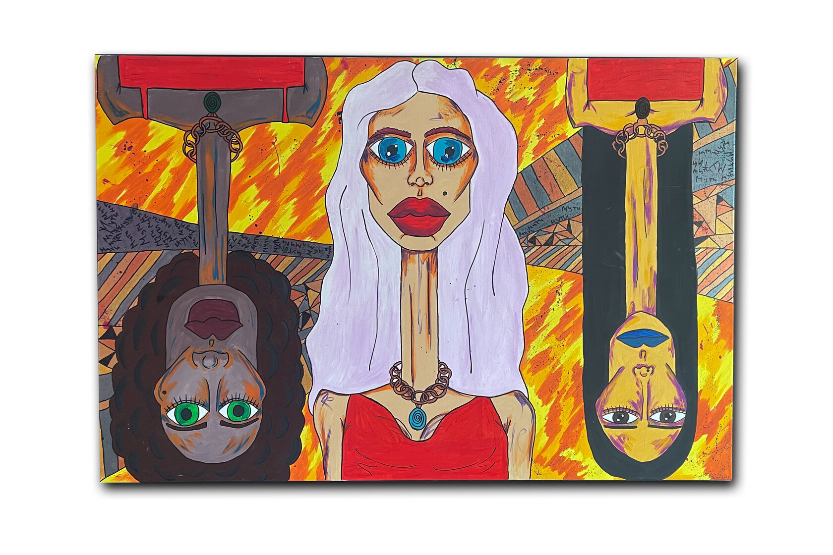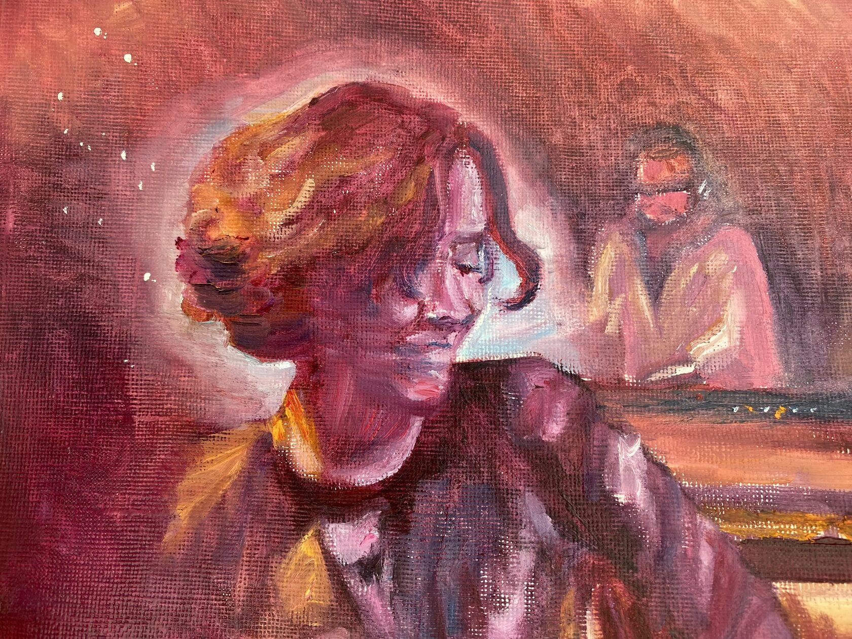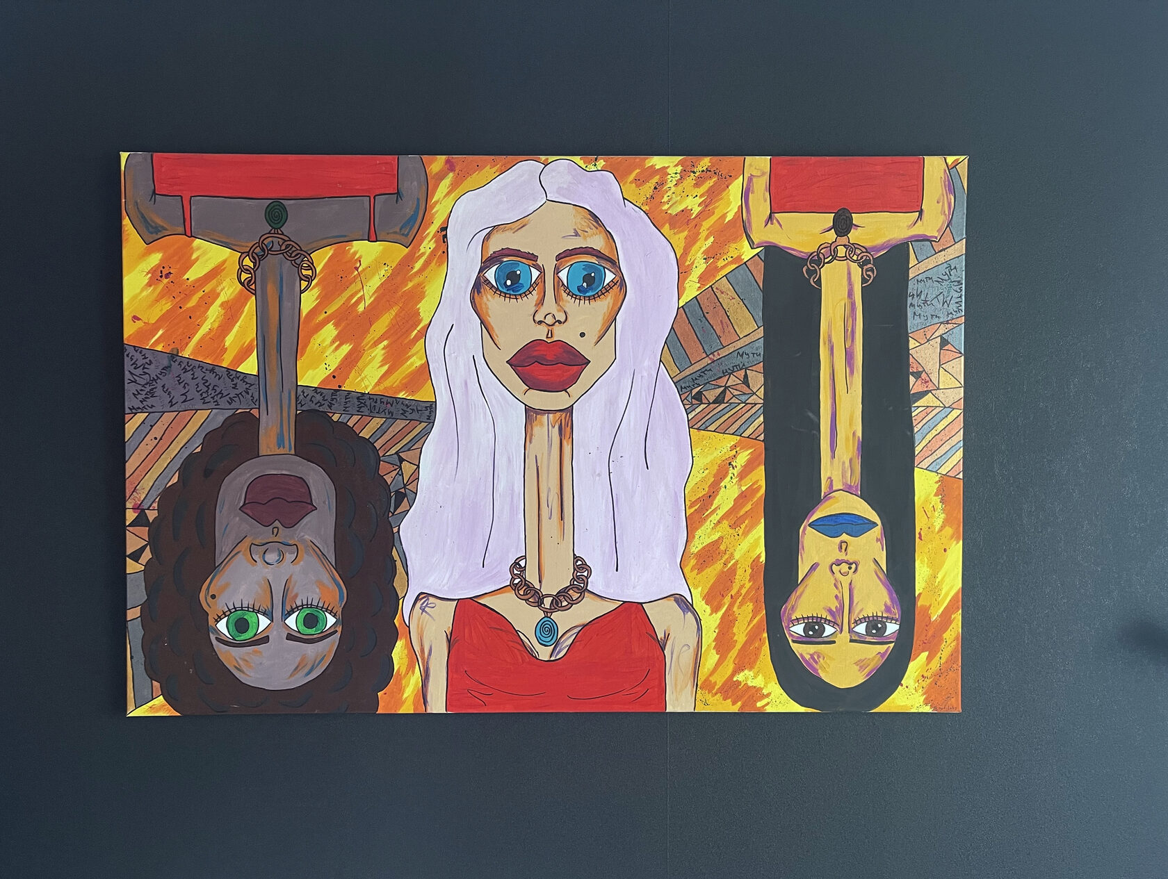 Погребена под их взглядами — это работа о сокрытом, о внутреннем «я», которое не может пробиться сквозь слой чужих суждений. Здесь фигура словно растворяется под тяжестью взглядов, оценок и общественных норм. Цвета налегают друг на друга, как слои восприятия, создавая напряжение и ощущение подавления. Контур тела проступает из-под размытых форм, но остаётся неуловимым — как попытка быть увиденным, не становясь объектом суждений. Это не просто образ, а вопрос: а кто я, если снять с себя чужой взгляд?