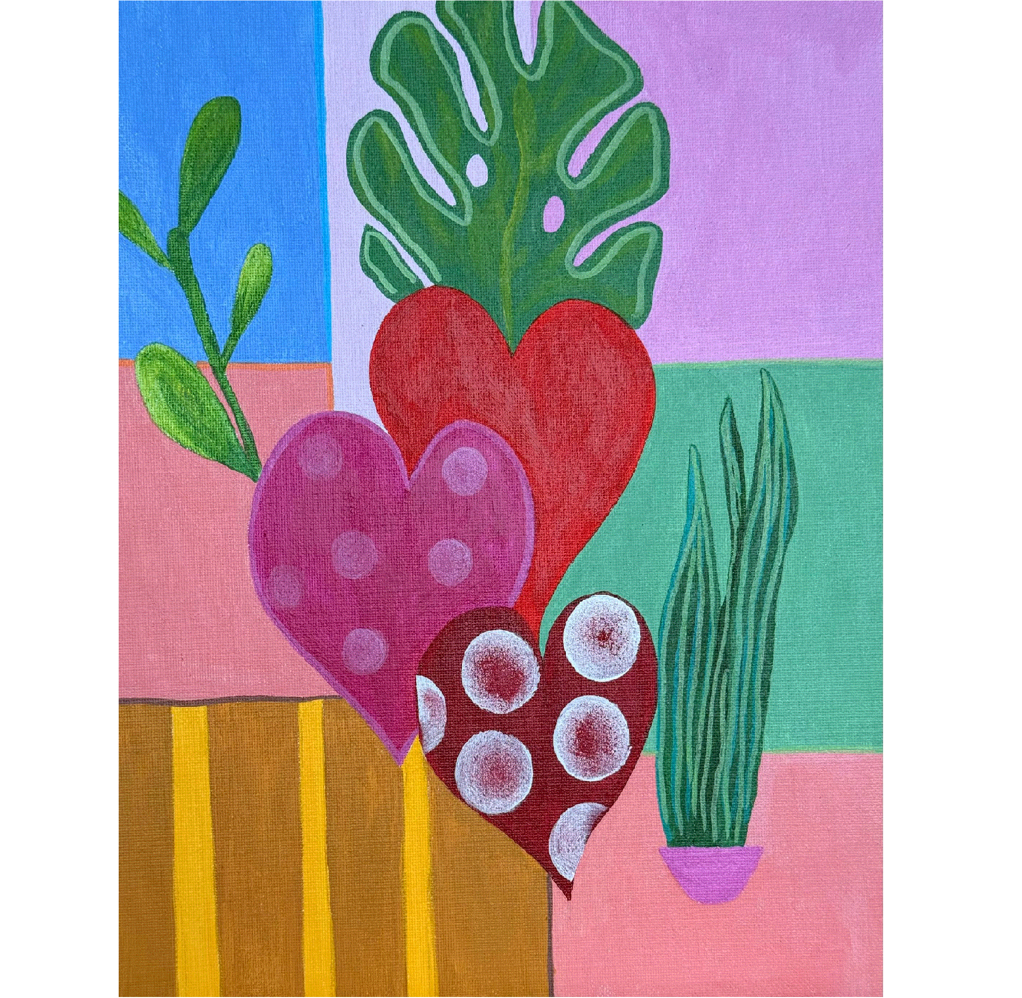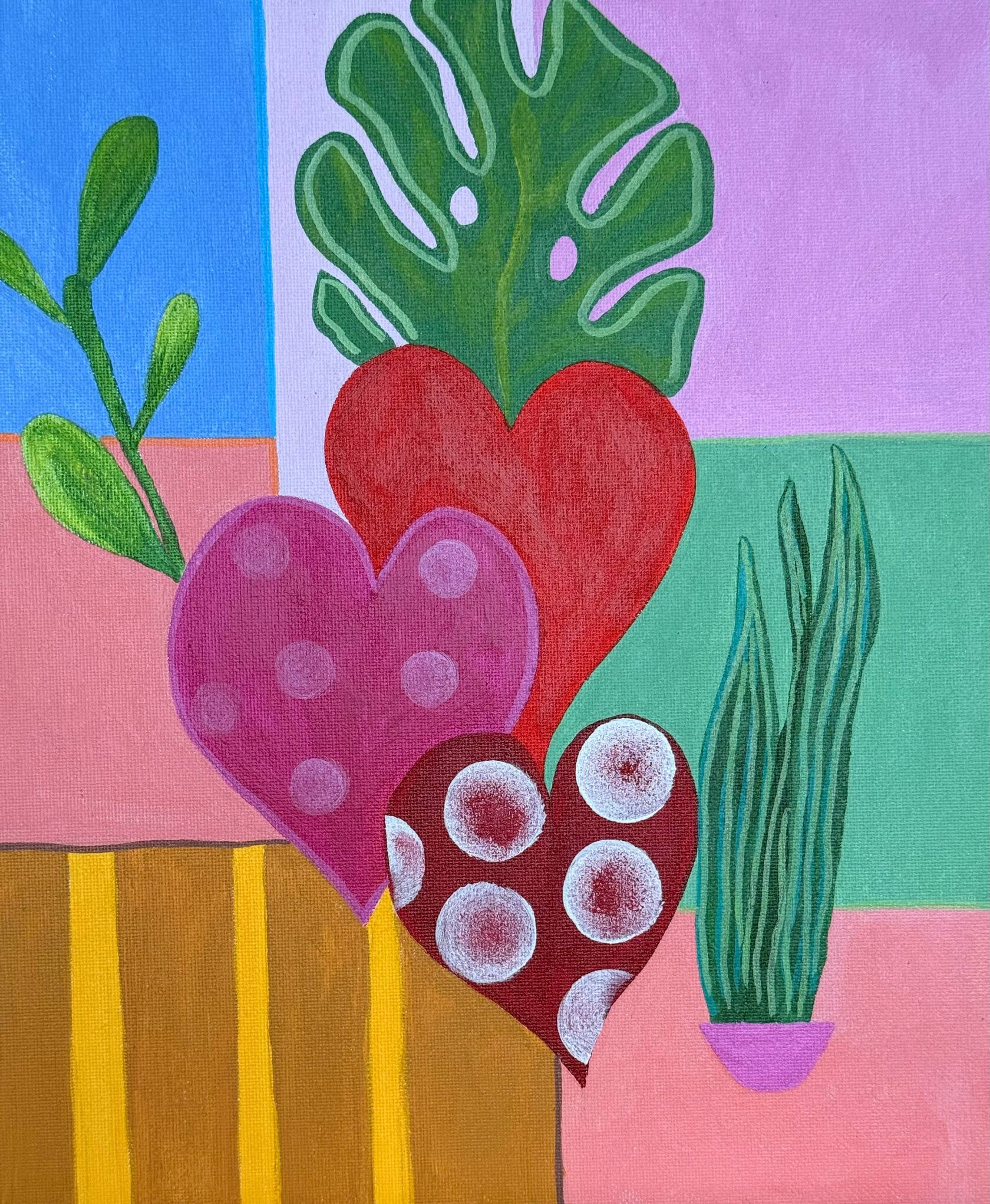 На картине — тихая интерьерная сцена, где три стилизованных сердца с разными узорами и оттенками будто растут как домашние растения. Фон составлен из мягких цветных прямоугольников и полос, как фрагменты памяти, которые упорядочивают и одновременно разрезают пространство жизни. Большой монстероподобный лист и тонкие стебли суккулента напоминают, что чувства живут рядом с природой и требуют ухода. Разные текстуры — пятна, кольца и ровная заливка — читаются как отпечатки переживаний: повторяющиеся мотивы памяти, едва заметные раны и радости. Картина говорит о том, что любовь — не единая эмоция, а система отношений и привязанностей, аккуратно устроенных в бытовом ландшафте бытия.