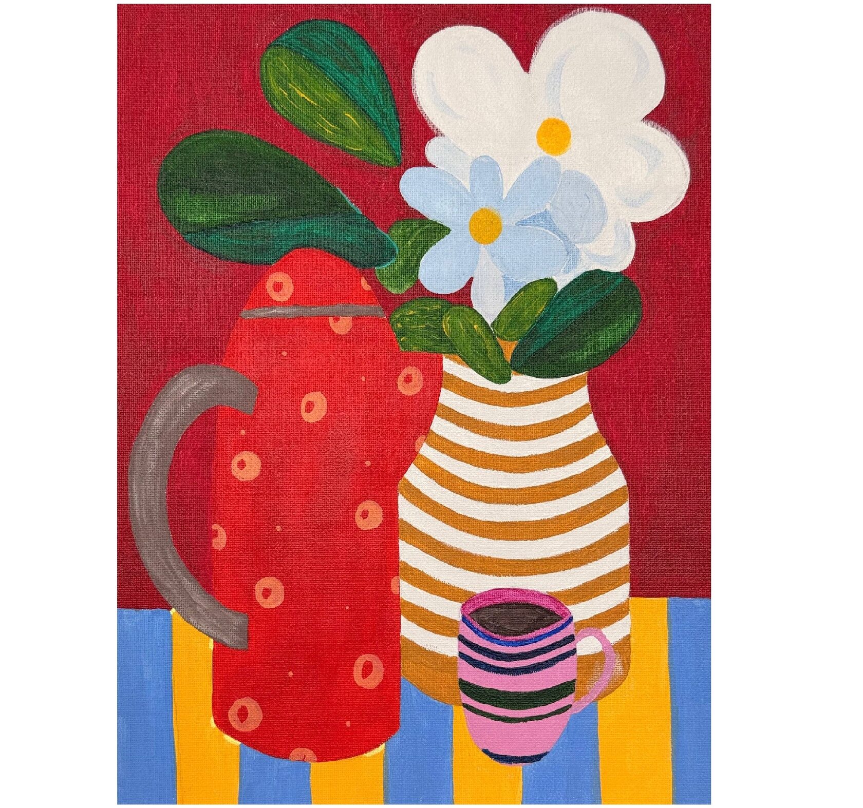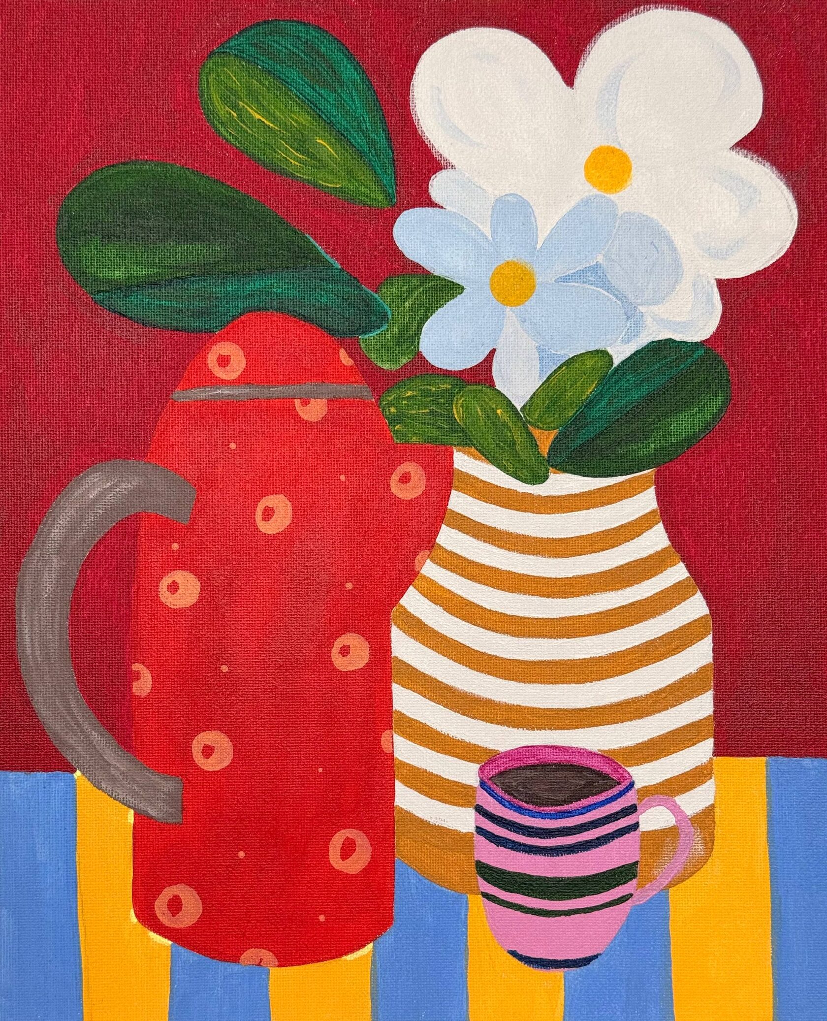 На картине — яркий, наивный натюрморт, где бытовые предметы превращены в декоративные, почти плоские силуэты. В центре — ваза в коричнево-белую полоску с пышным букетом белых цветов и крупными зелёными листьями; рядом стоит красный термос с крупными горошинами ,а впереди— маленькая розовая чашка с тёмным кофе. Фон глубокого бордового цвета подчёркивает контрастные, сочные тона предметов, а стол покрыт ритмичными жёлто-голубыми полосами, создающими ощущение движения. Картина играет узорами — полосами и кружками — и строит гармонию через смелое сочетание цвета и простоту форм. Видна фактура холста и уверенные мазки, что добавляет работе тепла и непосредственности. Настроение — уютное и немного игривое; композиция словно приглашает начать утро с чашки кофе среди любимых вещей.